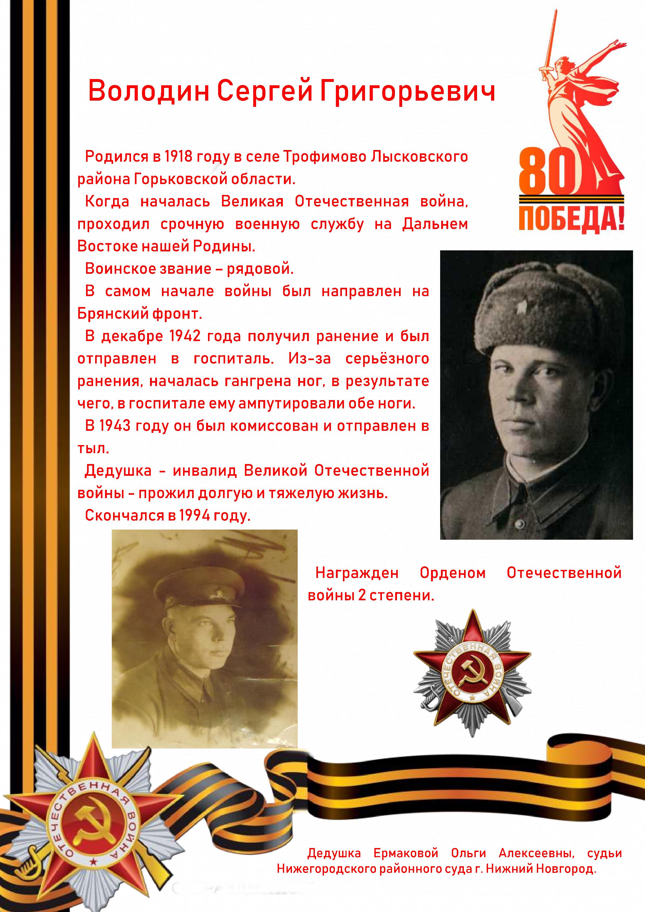 Продолжает серию публикаций Володин Сергей Григорьевич - дедушка Ермаковой Ольги Алексеевны, судьи Нижегородского районного суда г. Нижний Новгород.
