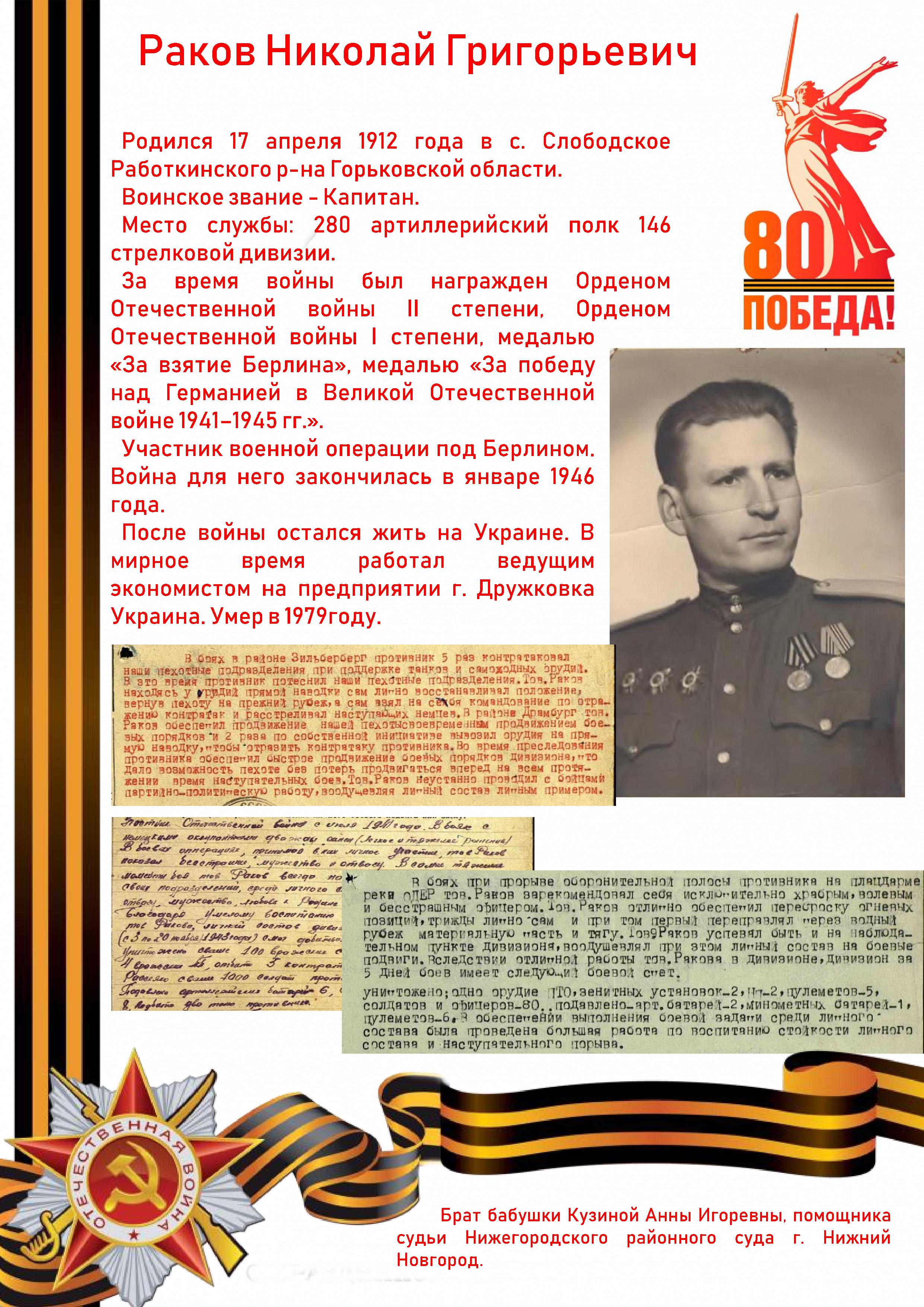 Продолжает серию публикаций Раков Николай Григорьевич - брат бабушки Кузиной Анны Игоревны, помощника судьи Нижегородского районного суда г. Нижний Новгород. ![]() |