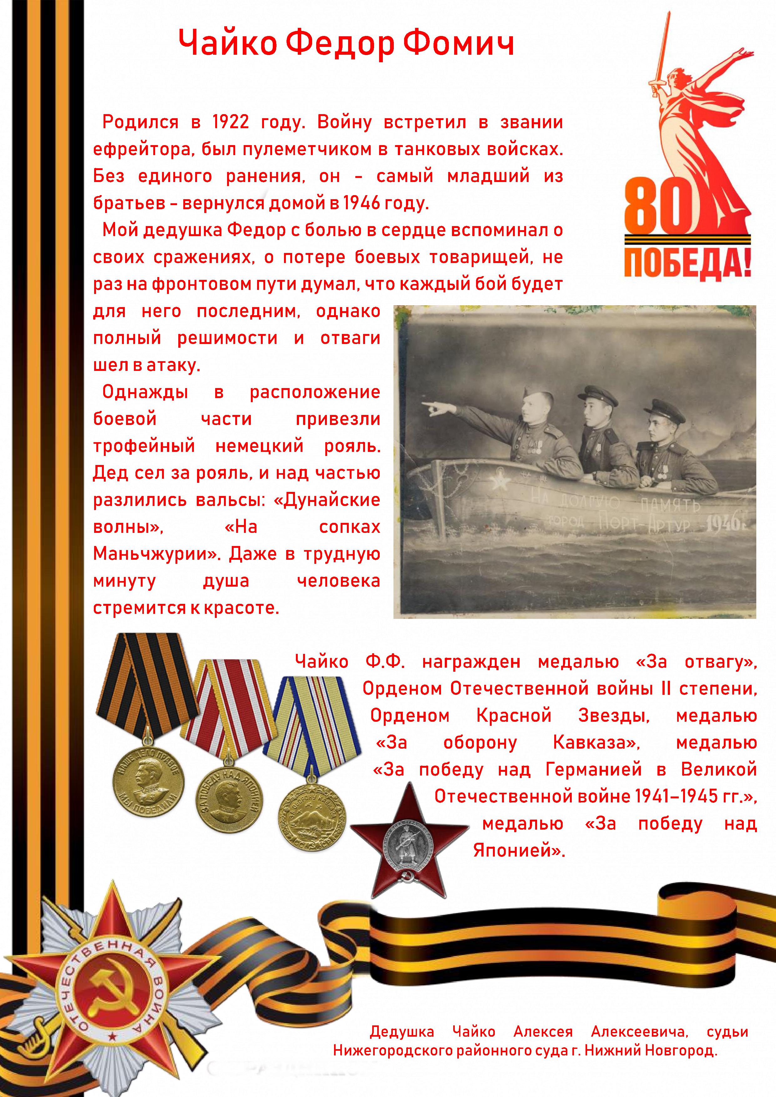 Продолжает серию публикаций Чайко Федор Фомич - дедушка Чайко Алексея Алексеевича, судьи Нижегородского районного суда г. Нижний Новгород.